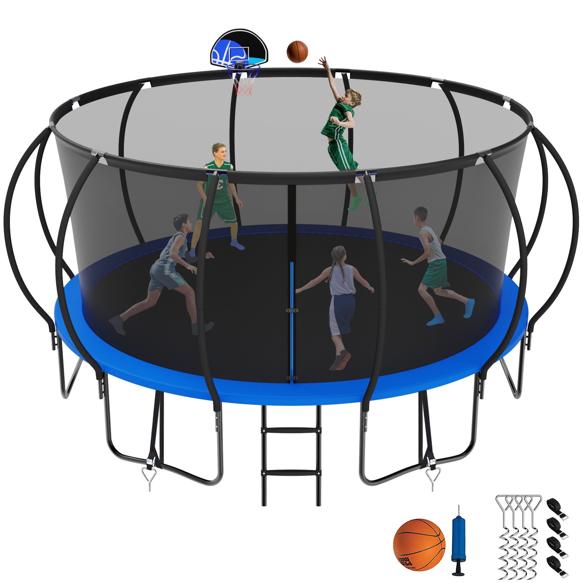 Jump Into Fun 15FT Trampoline for Adults/Kids, Trampoline with Enclosure, Basketball Hoop, Ladder, Wind Stakes, 1500LBS Capacity for 8-9 Kids, Outdoor Galvanized Full Spray Round Trampoline, Blue