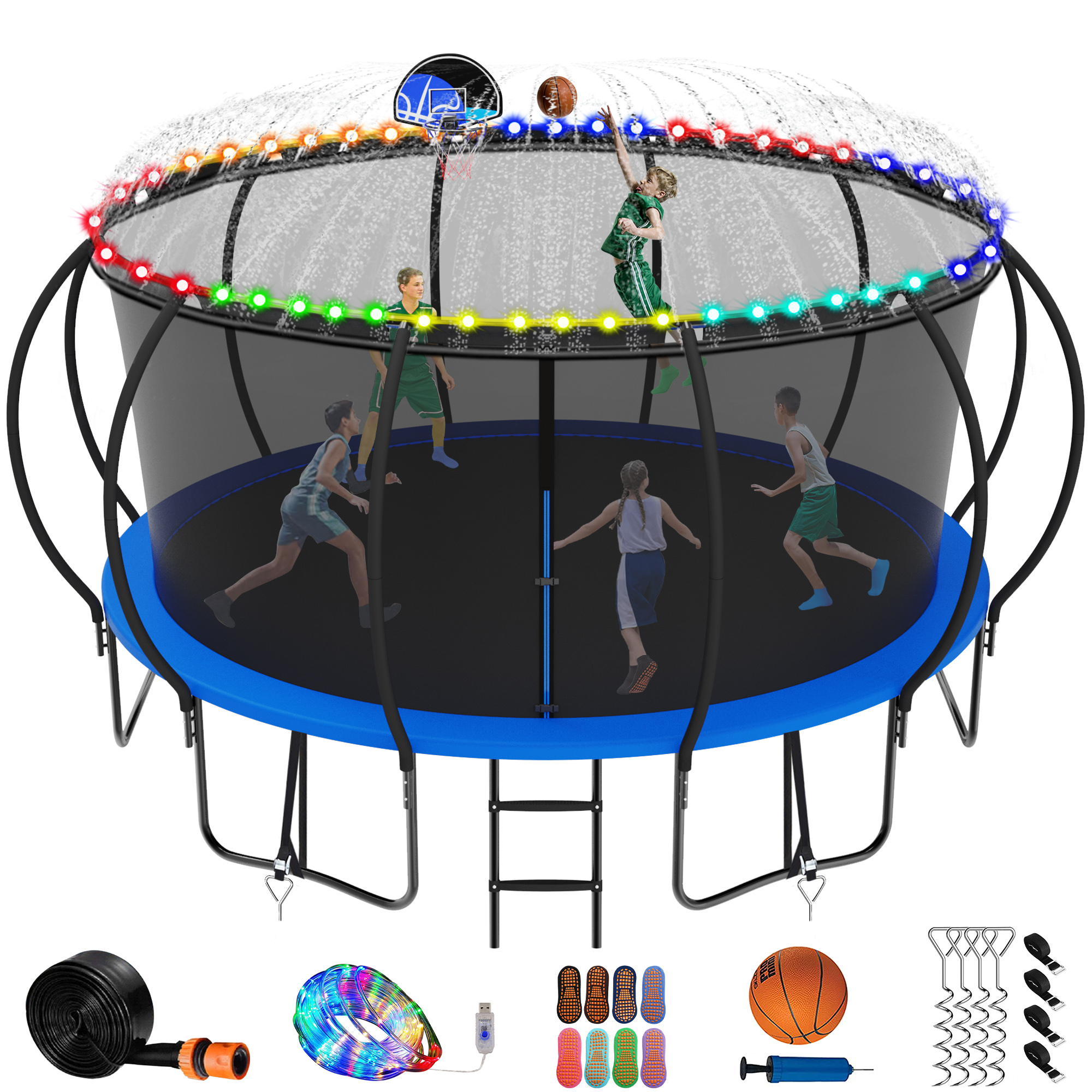 Jump Into Fun 15FT Trampoline for Adults/Kids, Trampoline with Enclosure, Basketball Hoop, Light, Sprinkler, Socks, 1500LBS Capacity for 8-9 Kids, Outdoor Galvanized Full Spray Round Trampoline, Blue