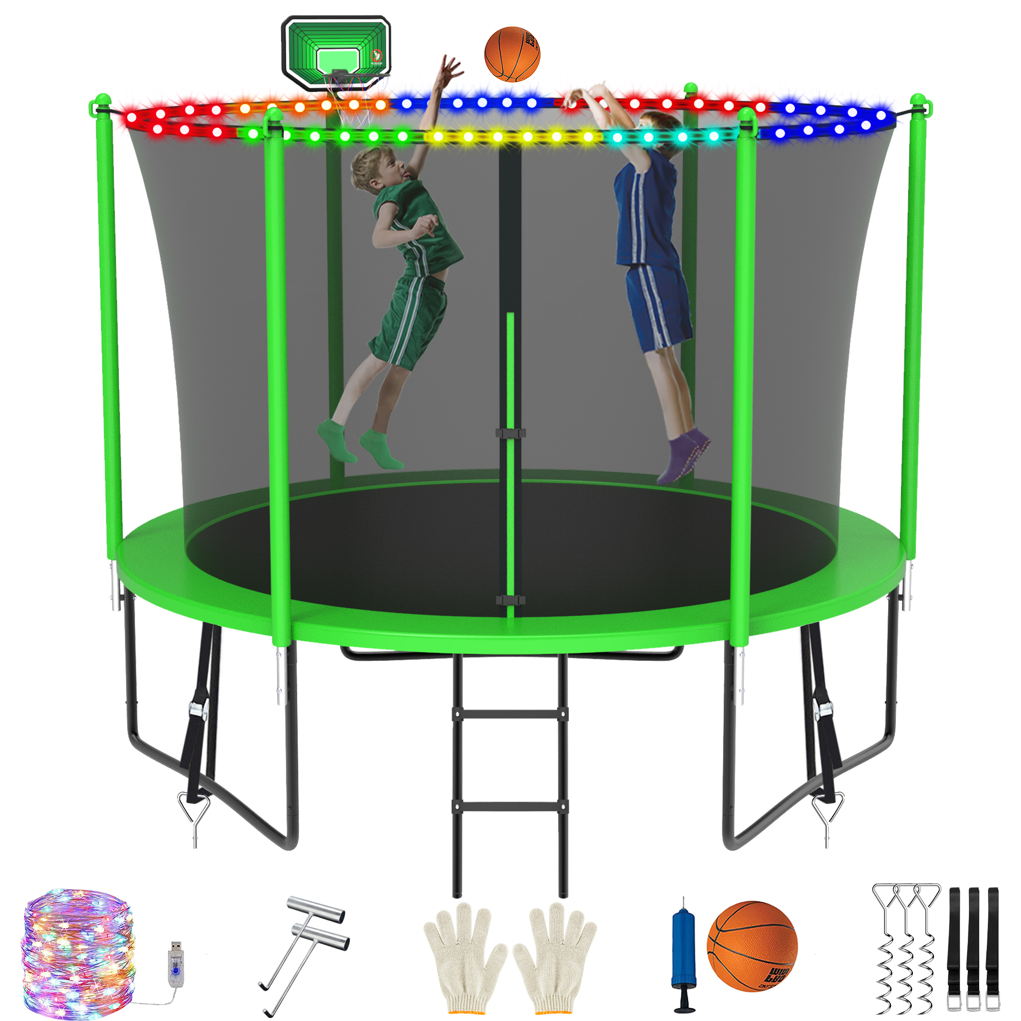Jump Into Fun 8FT Trampoline for 2-3 Kids, 800LBS Capacity Trampolines with Enclosure, LED Light, Basketball Hoop, Wind Stakes, Heavy Duty Outdoor Anti-Rust Coating Recreational Trampoline for Gift