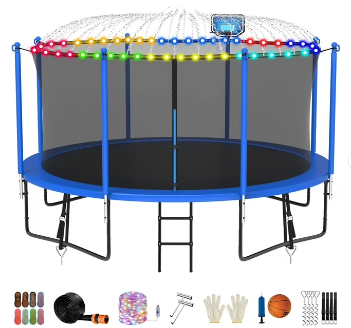 Jump Into Fun Trampoline 16FT, 1500LBS Trampoline for Adults/10 Kids, Outdoor Trampoline with Enclosure, Basketball Hoop, LED Lights, Sprinkler, Socks and Wind Stakes, Blue