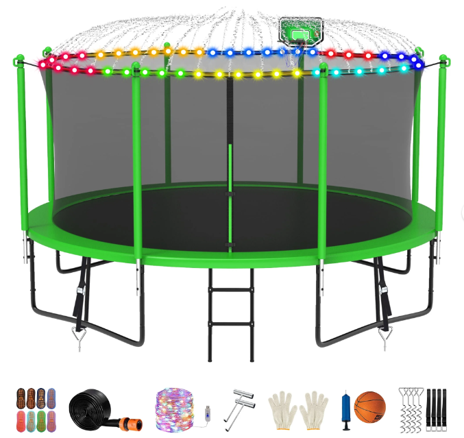 Jump Into Fun Trampoline 16FT, 1500LBS Trampoline for Adults/10 Kids, Outdoor Trampoline with Enclosure, Basketball Hoop, LED Lights, Sprinkler, Socks and Wind Stakes, Green