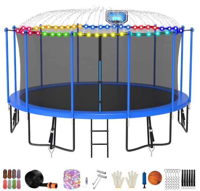 Jump Into Fun Trampoline 12FT 14FT 15FT 16FT, Trampoline for Adults and Kids with Enclosure, Basketball Hoop, Light, Sprinkler, Socks, Wind Stakes, 1500LBS Outdoor Recreational Trampolines, Blue quantity