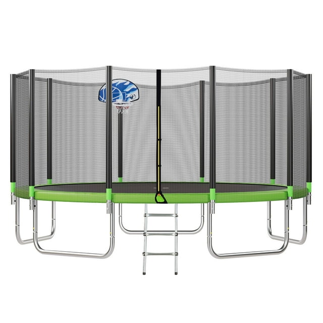 Jump Into Fun Trampoline 15FT 1400LBS for 3-4 Adults/7-8 Kids, Trampoline with Safety Enclosure Net, Basketball Hoop and Ladder, Round Outdoor Recreational Trampoline