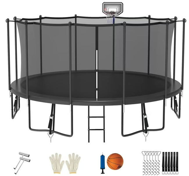 Jump Into Fun Trampoline for 7-8 Kids/ 3-4 Adults, 12FT 14FT 15FT 16FT 1400LBS Trampoline with Enclosure, Basketball Hoop, Wind Stakes, Ladder, Outdoor Recreational Trampoline