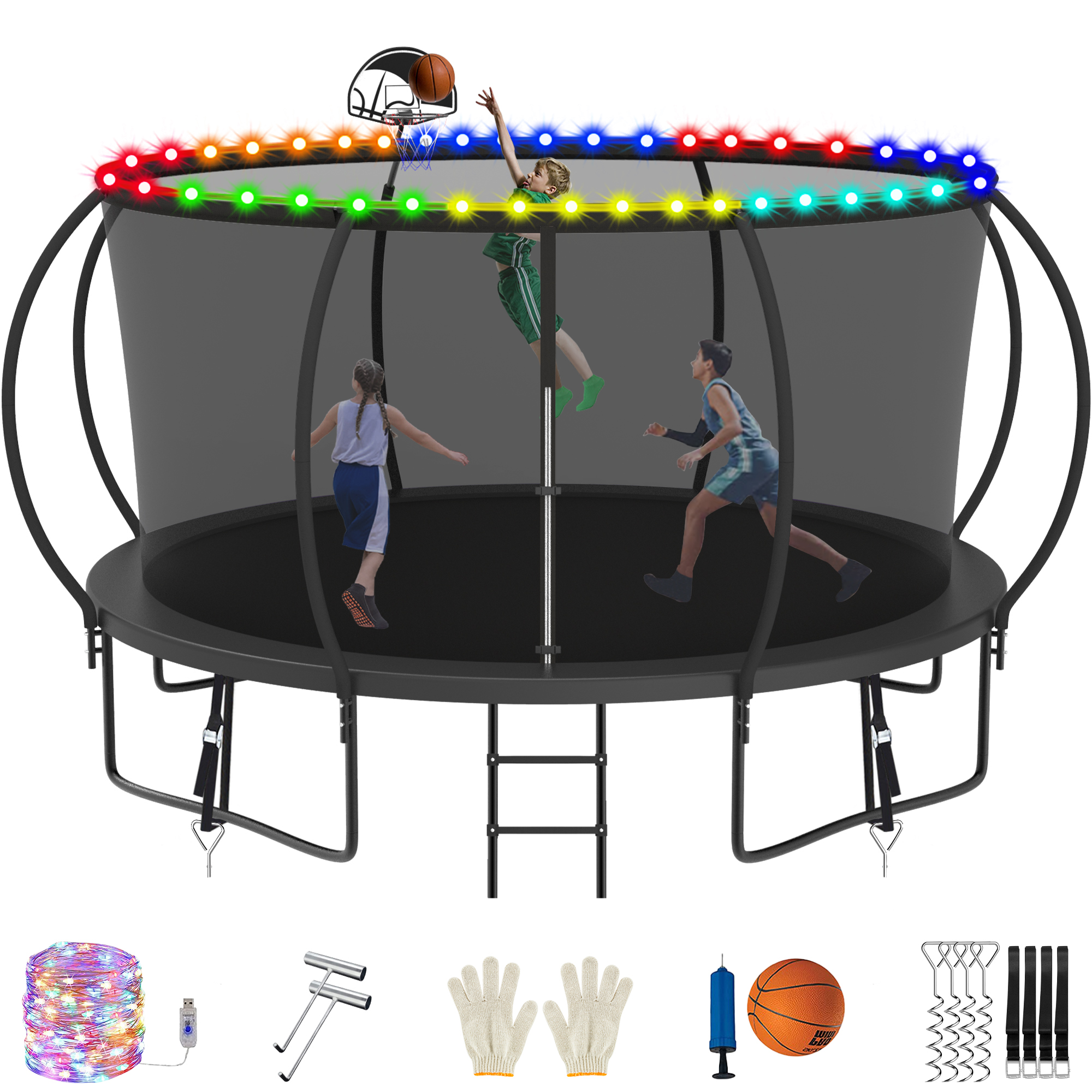 Jump Into Fun Trampoline, 16FT 15FT 14FT 12FT 10FT 8FT 1200LBS Trampoline for Adults/5-6 Kids with Enclosure, LED Light, Basketball Hoop, Outdoor Anti-Rust Coating Recreational Trampoline for Gifts