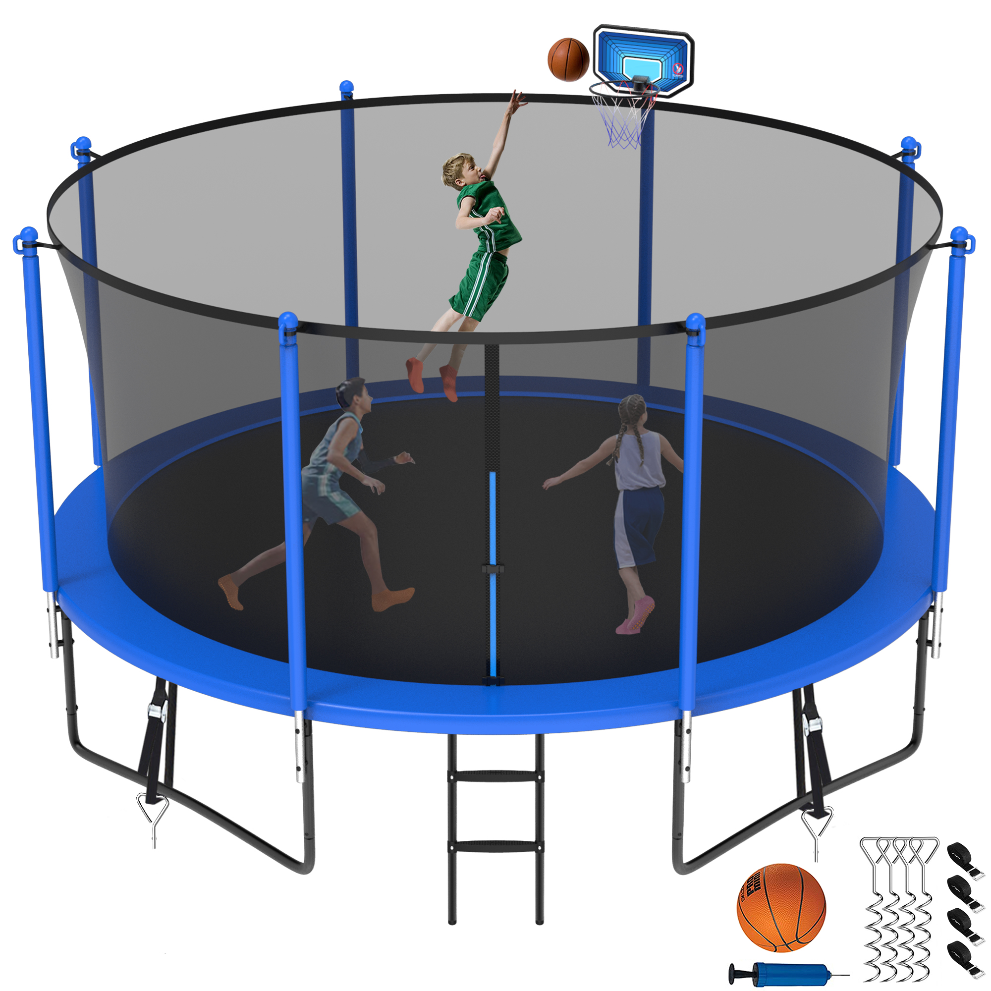 Jump Into Fun Trampoline for 7-8 Kids/ 3-4 Adults, 12FT 14FT 15FT 16FT 1400LBS Trampoline with Enclosure, Basketball Hoop, Wind Stakes, Ladder, Outdoor Recreational Trampoline