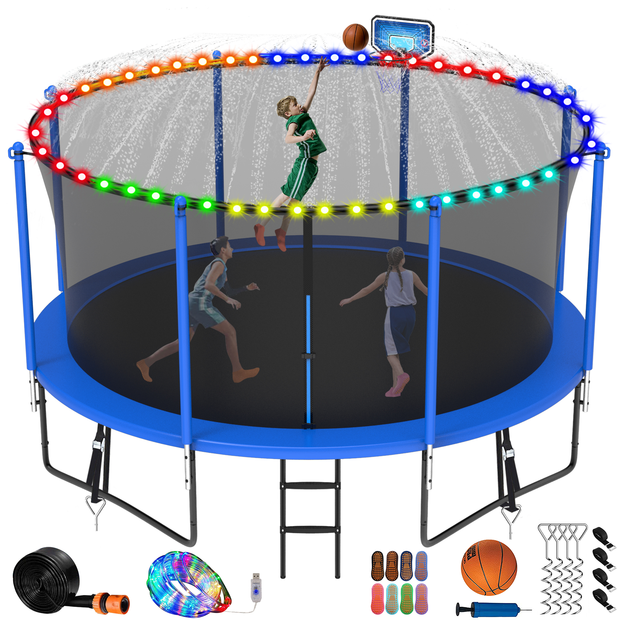 Jump Into Fun Trampoline 16FT, 1500LBS Trampoline for Adults/10 Kids, Outdoor Trampoline with Enclosure, Basketball Hoop, LED Lights, Sprinkler, Socks and Wind Stakes, Green