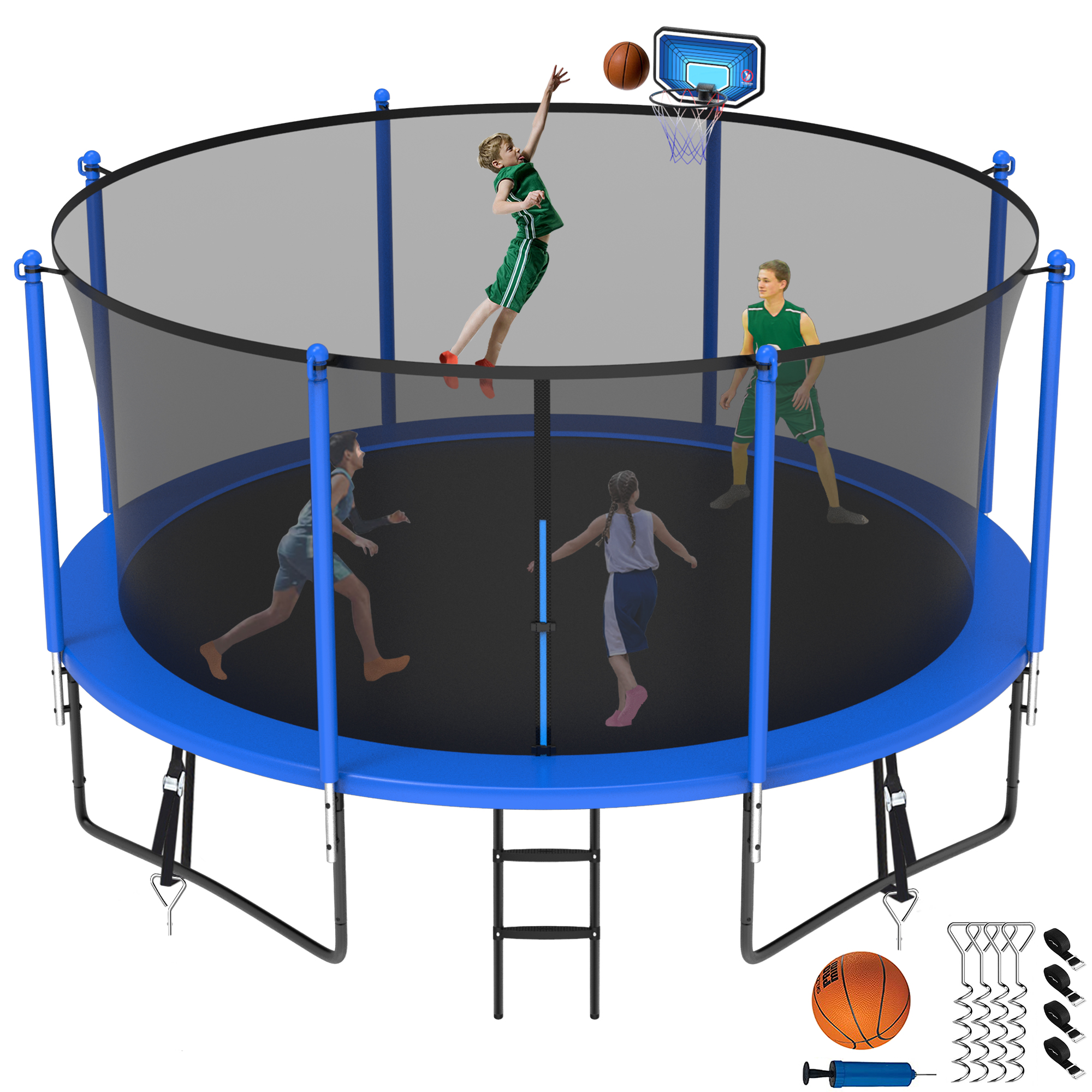 Jump Into Fun Trampoline 8 10 12 14 15 16FT, 1400LBS Trampoline for Kids Adults, Trampolines with Enclosure, Basketball Hoop, Wind Stakes, Galvanized Anti-Rust Coating, Outdoor Backyard Trampoline