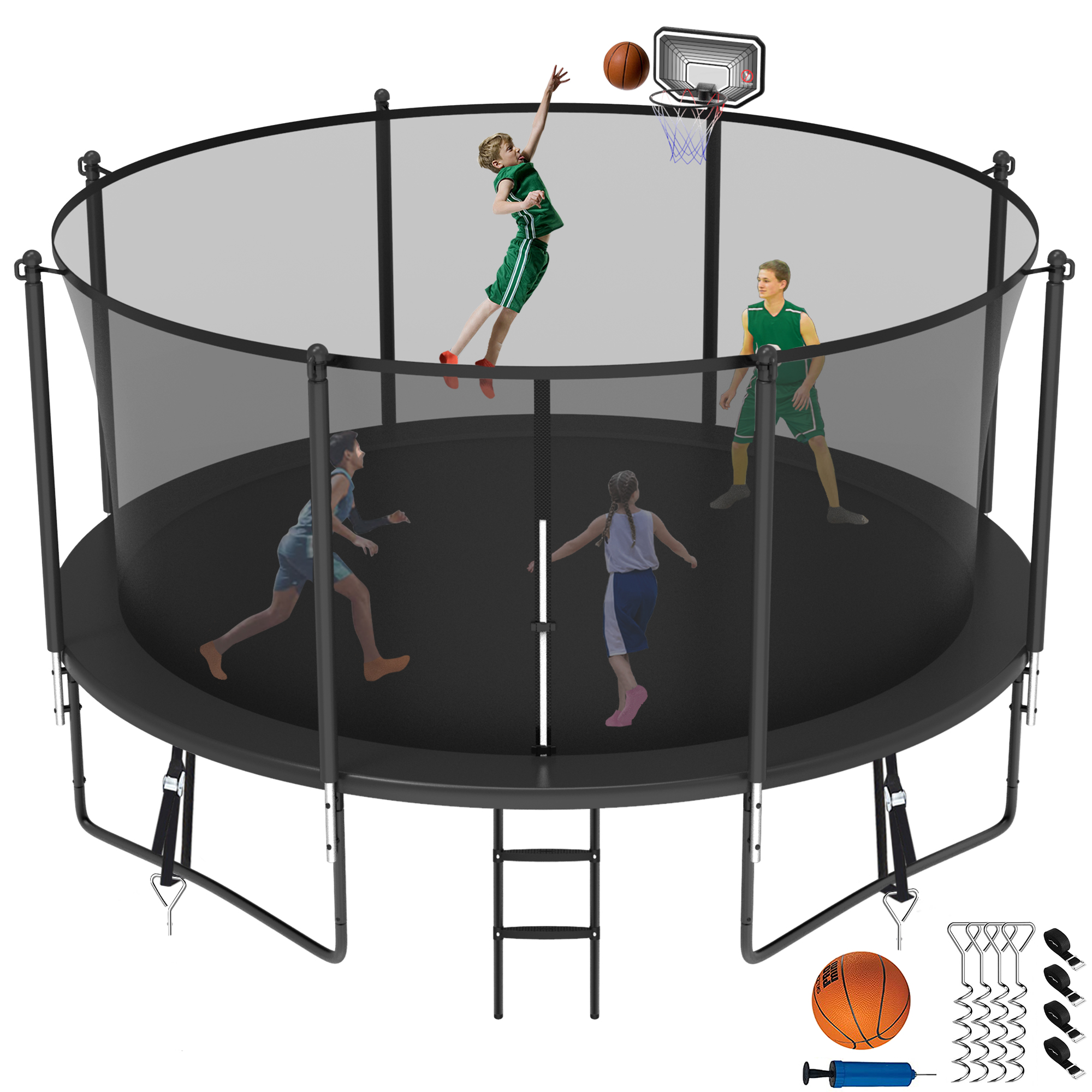 Jump Into Fun Trampoline for 8-9 Kids/ 3-5 Adults, 12FT 14FT 15FT 16FT 1500LBS Trampoline with Enclosure, Basketball Hoop, Wind Stakes, Ladder, Outdoor Recreational Trampoline