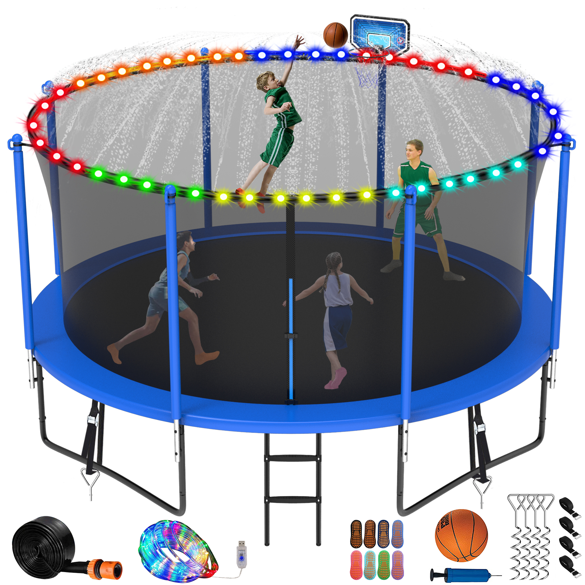 Jump Into Fun Trampoline 16FT, 1500LBS Trampoline for Adults/10 Kids, Outdoor Trampoline with Enclosure, Basketball Hoop, LED Lights, Sprinkler, Socks and Wind Stakes, Green