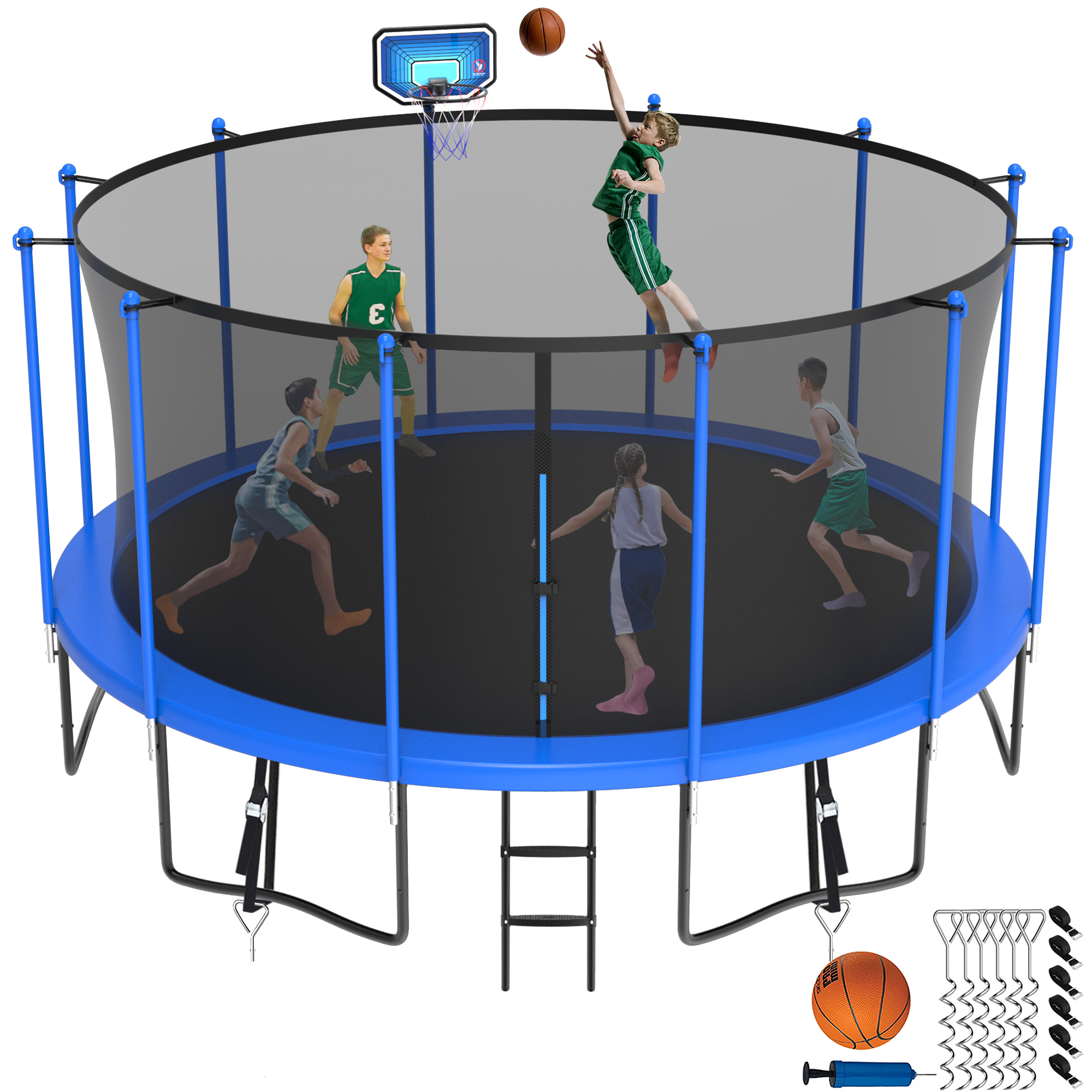 Jump Into Fun Trampoline for 10 Kids/ 4-5 Adults, 12FT 14FT 15FT 16FT 1500LBS Trampoline with Enclosure, Basketball Hoop, Wind Stakes, Ladder, Outdoor Recreational Trampoline
