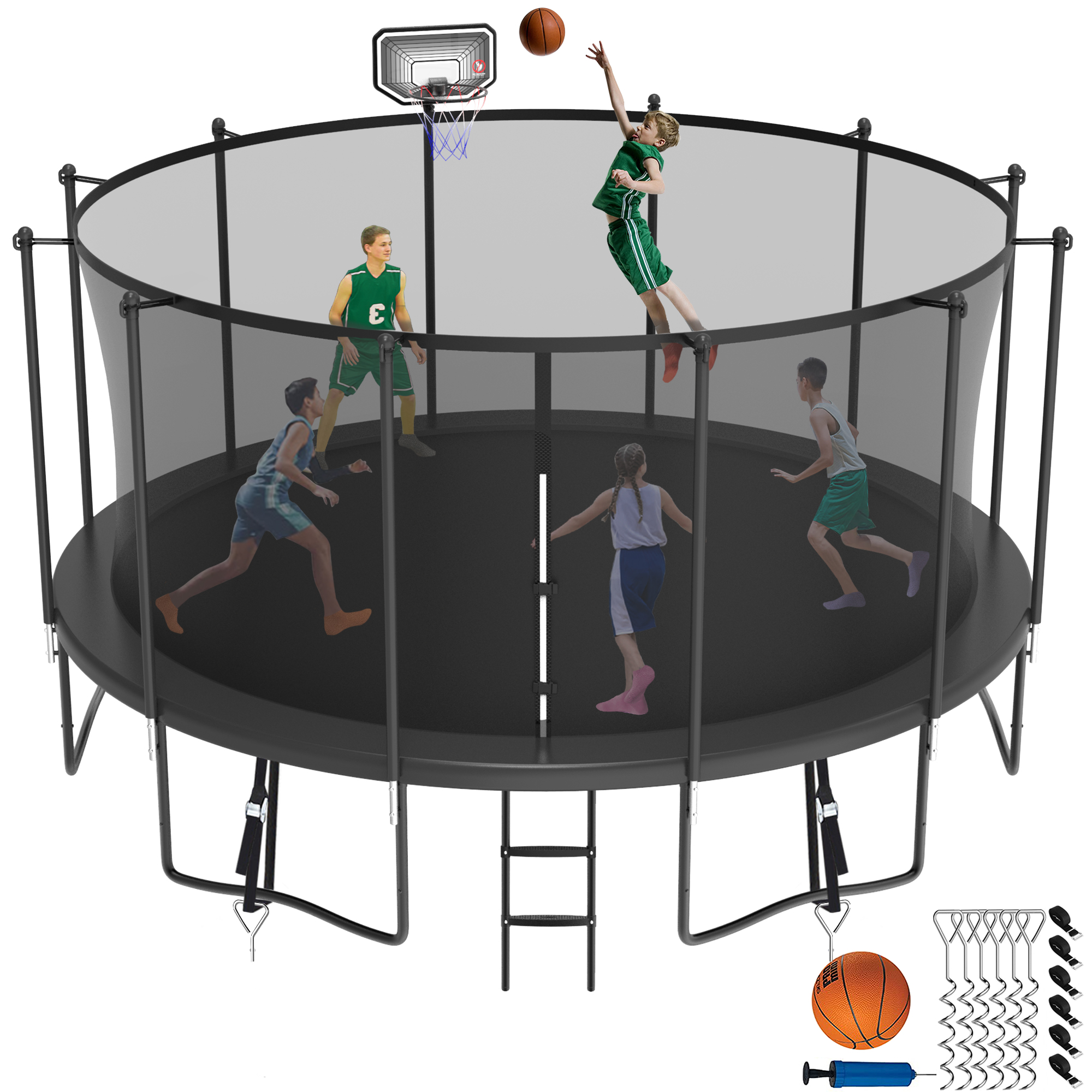 Jump Into Fun Trampoline for 7-8 Kids/ 3-4 Adults, 12FT 14FT 15FT 16FT 1400LBS Trampoline with Enclosure, Basketball Hoop, Wind Stakes, Ladder, Outdoor Recreational Trampoline