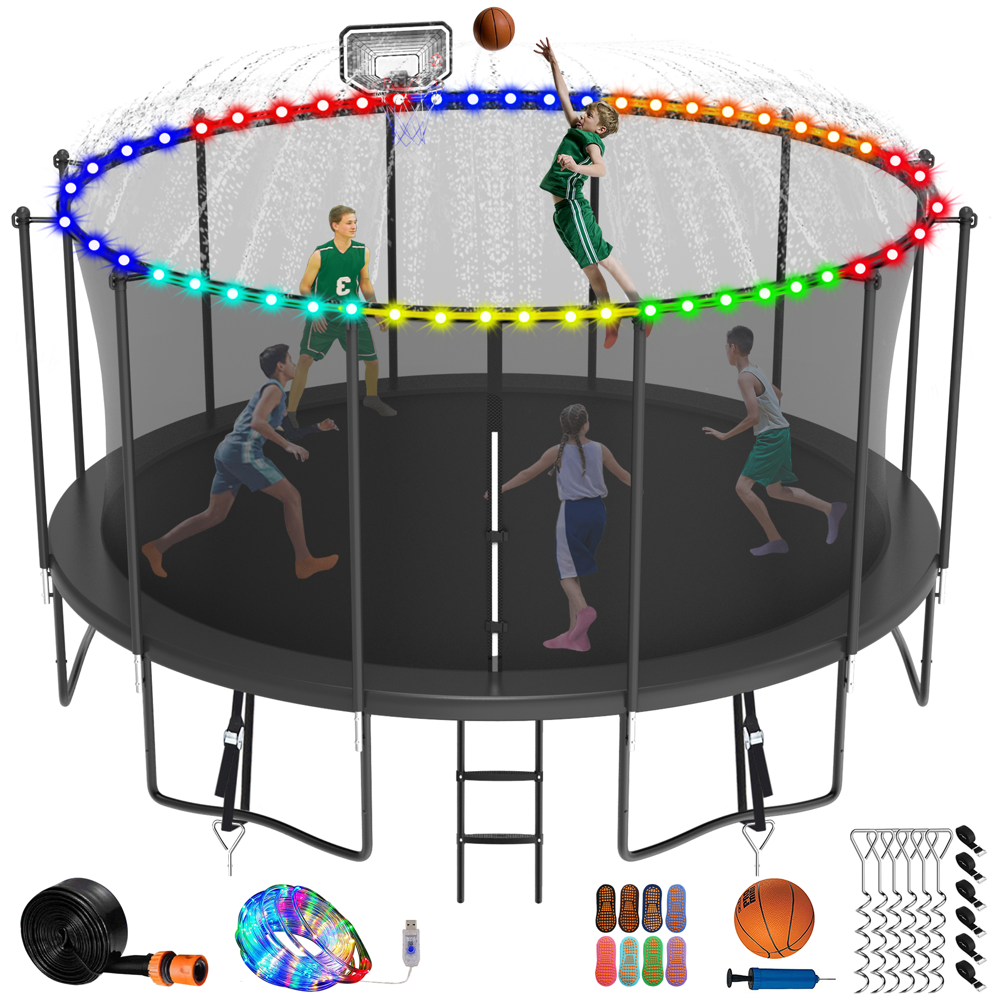 Jump Into Fun Trampoline 14FT 1400LBS for Adults/7-8 Kids, Outdoor Trampolines with Enclosure, Basketball Hoop, Light, Sprinkler, Socks, Wind Stakes, Heavy Duty Recreational Trampoline