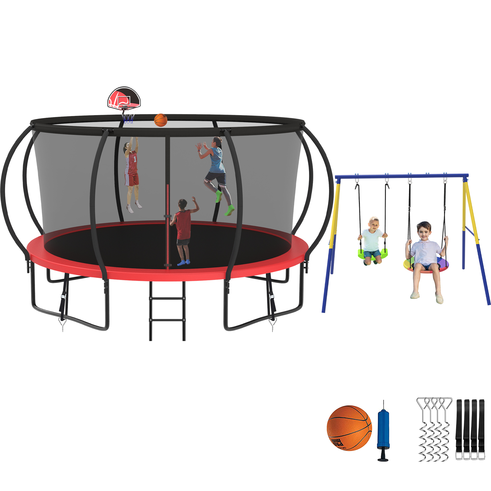 Jump Into Fun Trampoline for 5-6 Kids/ 2-3 Adults, 12FT 14FT 15FT 16FT 1200LBS Trampoline with Enclosure, Basketball Hoop, Wind Stakes, Ladder, Outdoor Recreational Trampoline