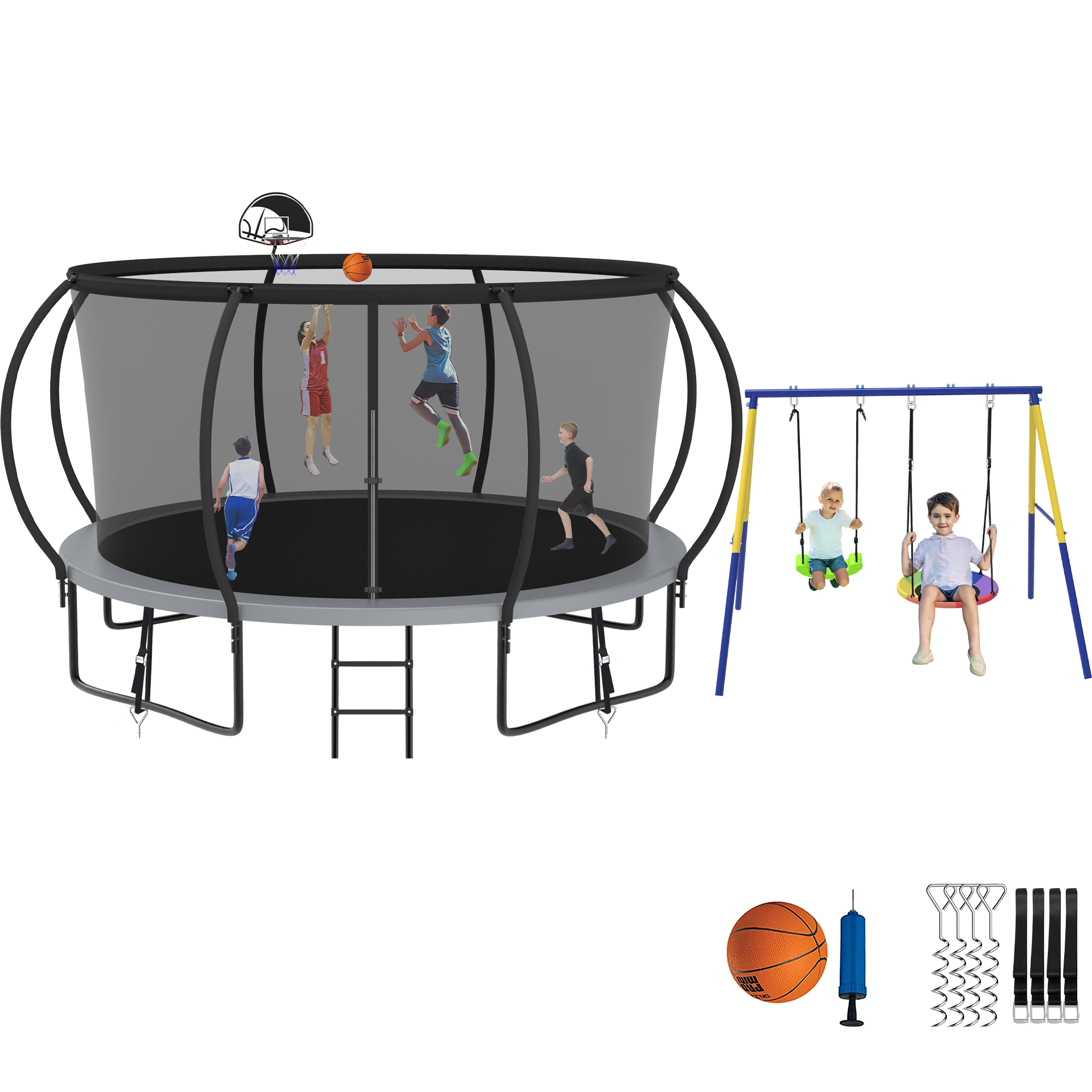 Jump Into Fun Trampoline 8 10 12 14 15 16FT, Trampoline with Enclosure, Basketball Hoop, Swing and Wind Stakes, 1400LBS Trampoline for 2-3 Adults/ 6-7 Kids, Outdoor Galvanized Spray Trampoline