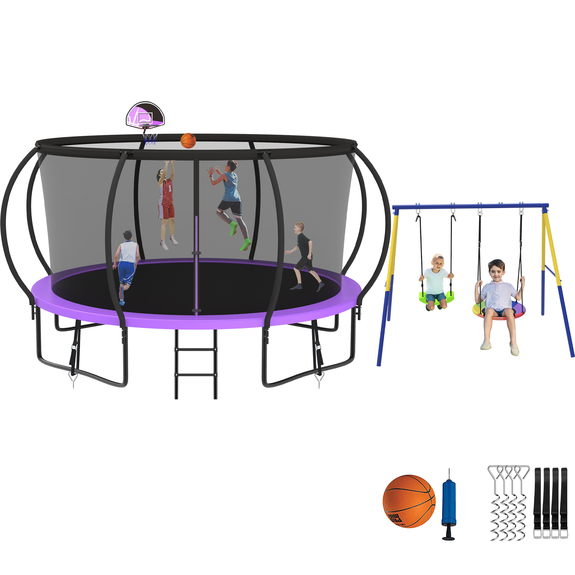 Jump Into Fun Trampoline 8 10 12 14 15 16FT, Trampoline with Enclosure, Basketball Hoop, Swing and Wind Stakes, 1400LBS Trampoline for 2-3 Adults/ 6-7 Kids, Outdoor Galvanized Spray Trampoline