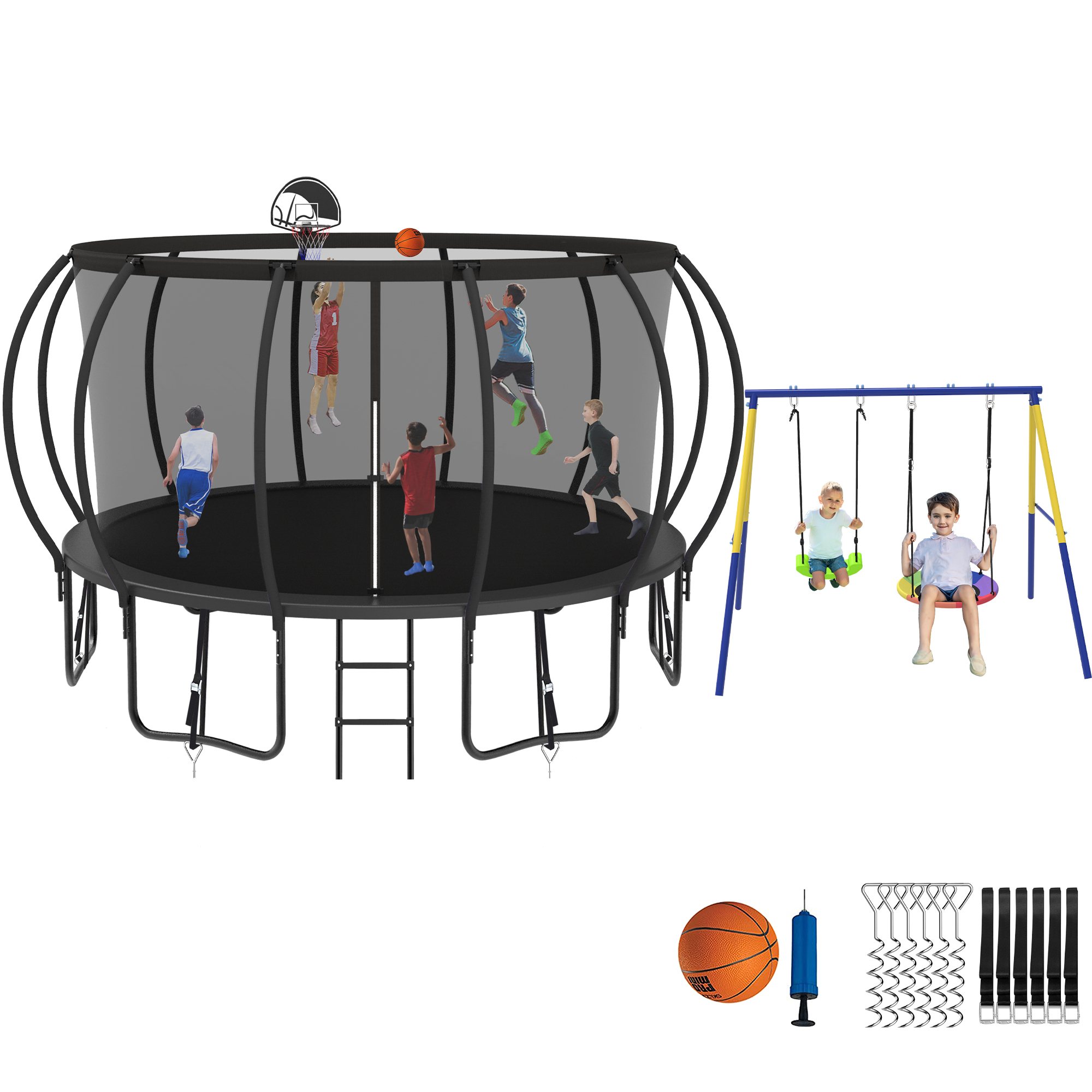 Jump Into Fun Trampoline 8 10 12 14 15 16FT, Trampoline with Enclosure, Basketball Hoop, Swing and Wind Stakes, 1500LBS Trampoline for 3-4 Adults/ 7-8 Kids, Outdoor Galvanized Spray Trampoline