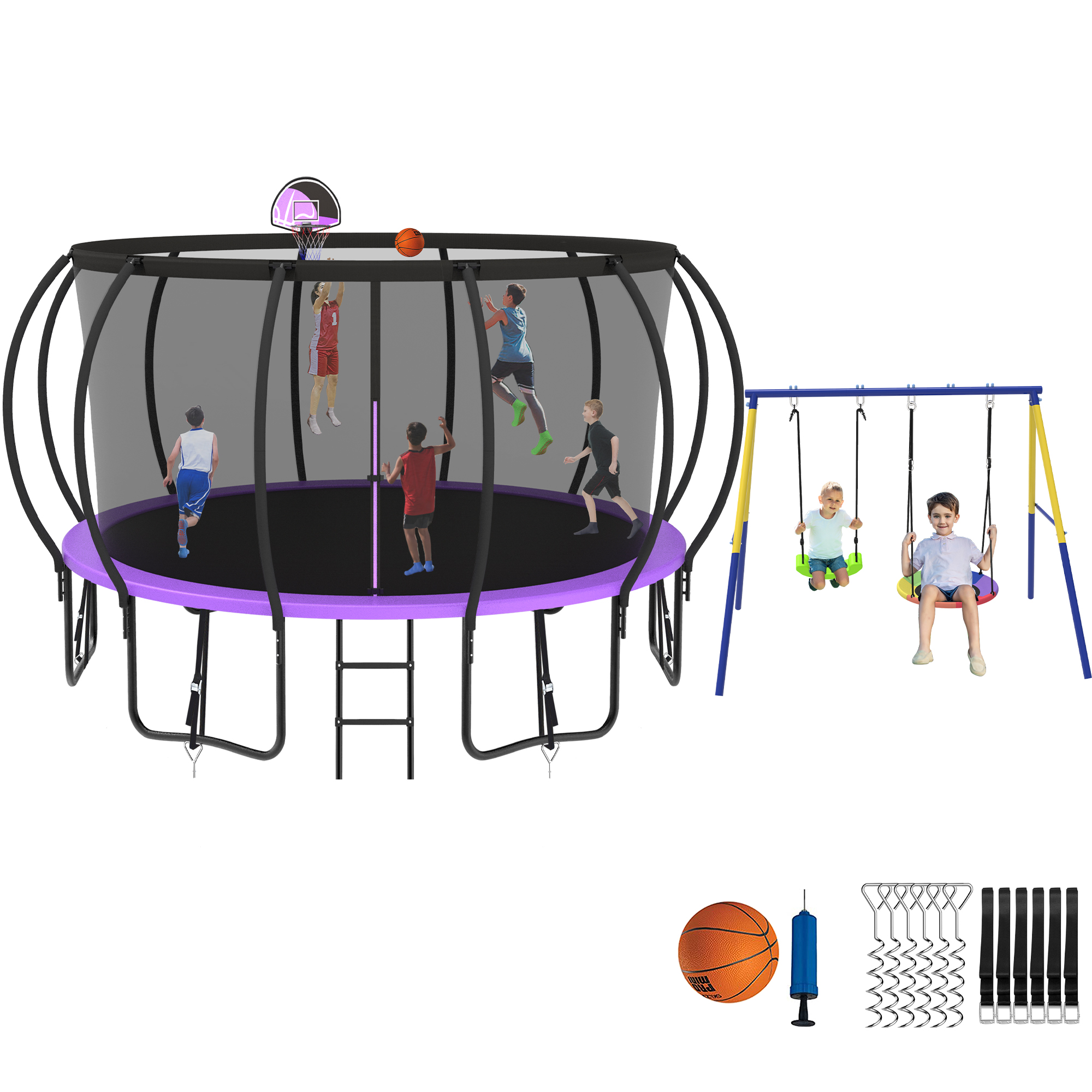 Jump Into Fun Trampoline for 8-9 Kids/ 3-5 Adults, 12FT 14FT 15FT 16FT 1500LBS Trampoline with Enclosure, Basketball Hoop, Wind Stakes, Ladder, Outdoor Recreational Trampoline
