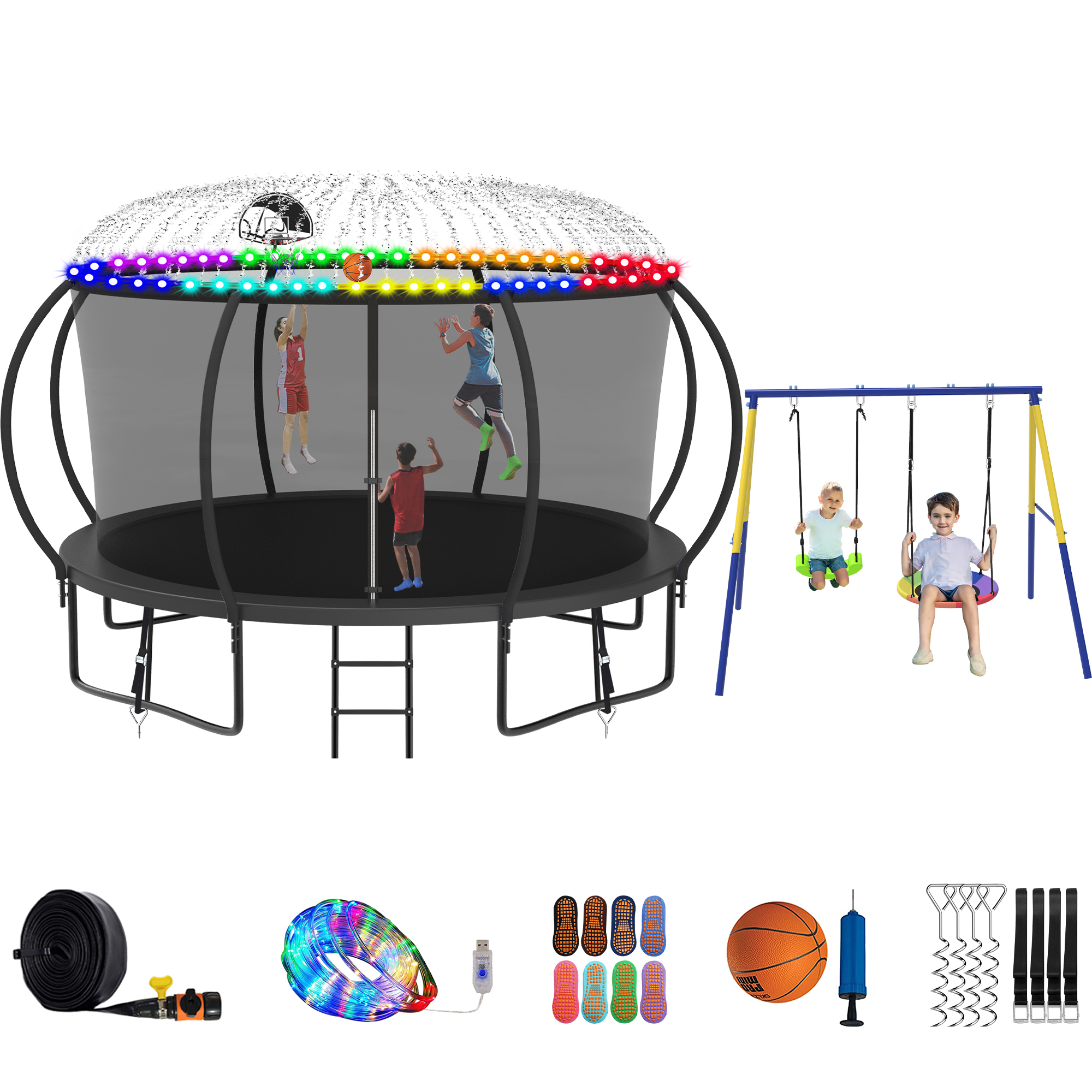 Jump Into Fun Trampoline 8 10 12 14 15 16FT, Trampoline with Enclosure, Basketball Hoop, Swing, LED Light and Gifts, 1200LBS Trampoline for 1-2 Adults/ 5-6 Kids, Outdoor Galvanized Spray Trampoline quantity