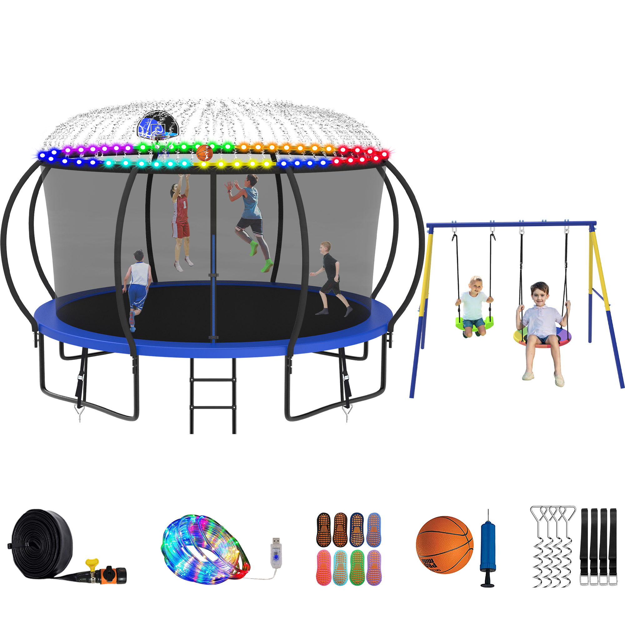 Jump Into Fun Trampoline 8 10 12 14 15 16FT, Trampoline with Enclosure, Basketball Hoop, Swing, LED Light and Gifts, 1400LBS Trampoline for 2-3 Adults/ 6-7 Kids, Outdoor Galvanized Spray Trampoline