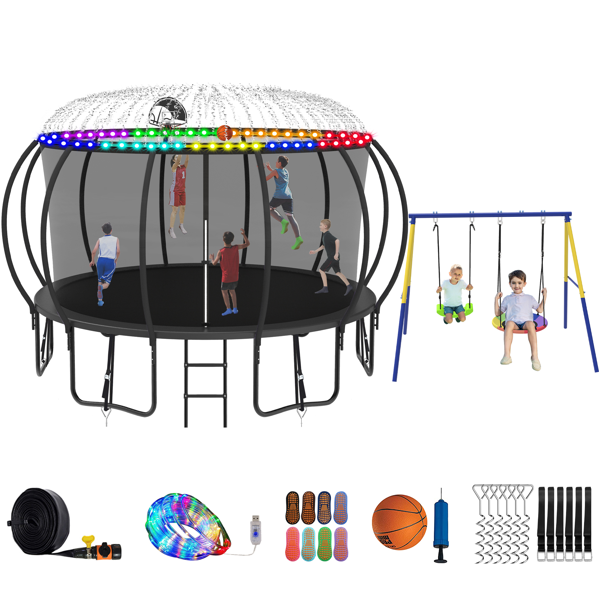 Jump Into Fun Trampoline 8 10 12 14 15 16FT, Trampoline with Enclosure, Basketball Hoop, Swing, LED Light and Gifts, 1500LBS Trampoline for 3-4 Adults/ 7-8 Kids, Outdoor Galvanized Spray Trampoline