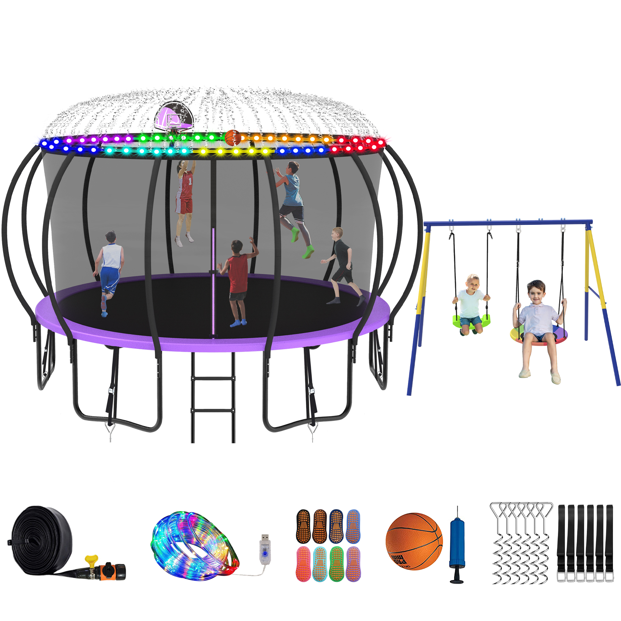 Jump Into Fun Trampoline 8 10 12 14 15 16FT, Trampoline with Enclosure, Basketball Hoop, Swing, LED Light and Gifts, 1500LBS Trampoline for 3-4 Adults/ 7-8 Kids, Outdoor Galvanized Spray Trampoline quantity