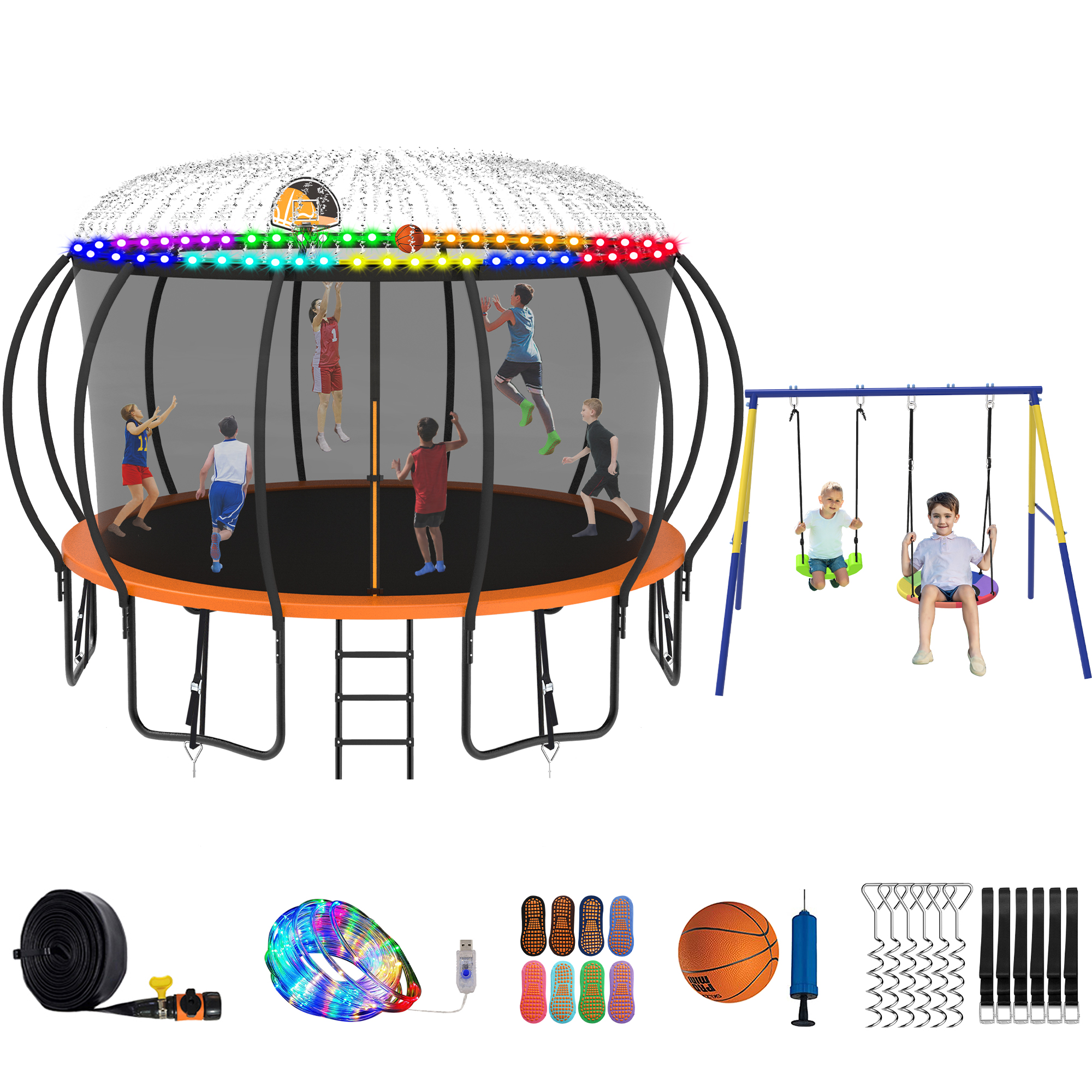Jump Into Fun Trampoline 8 10 12 14 15 16FT, Trampoline with Enclosure, Basketball Hoop, Swing, LED Light and Gifts, 1500LBS Trampoline for 4-5 Adults/ 9-10 Kids, Outdoor Galvanized Spray Trampoline