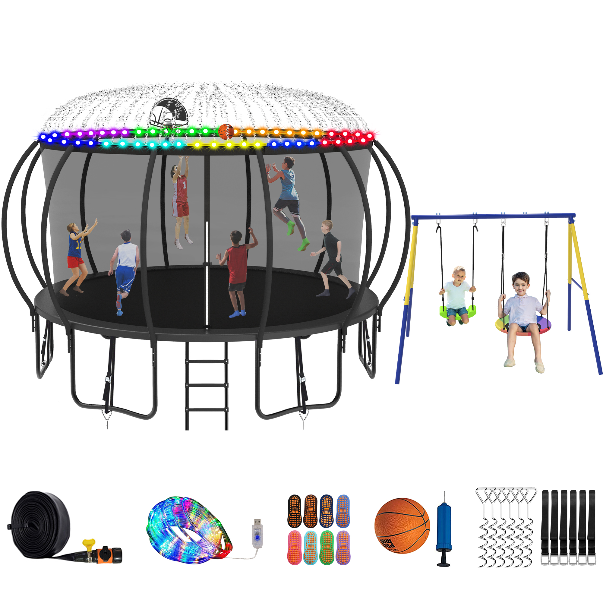Jump Into Fun Trampoline 8 10 12 14 15 16FT, Trampoline with Enclosure, Basketball Hoop, Swing, LED Light and Gifts, 1500LBS Trampoline for 4-5 Adults/ 9-10 Kids, Outdoor Galvanized Spray Trampoline quantity