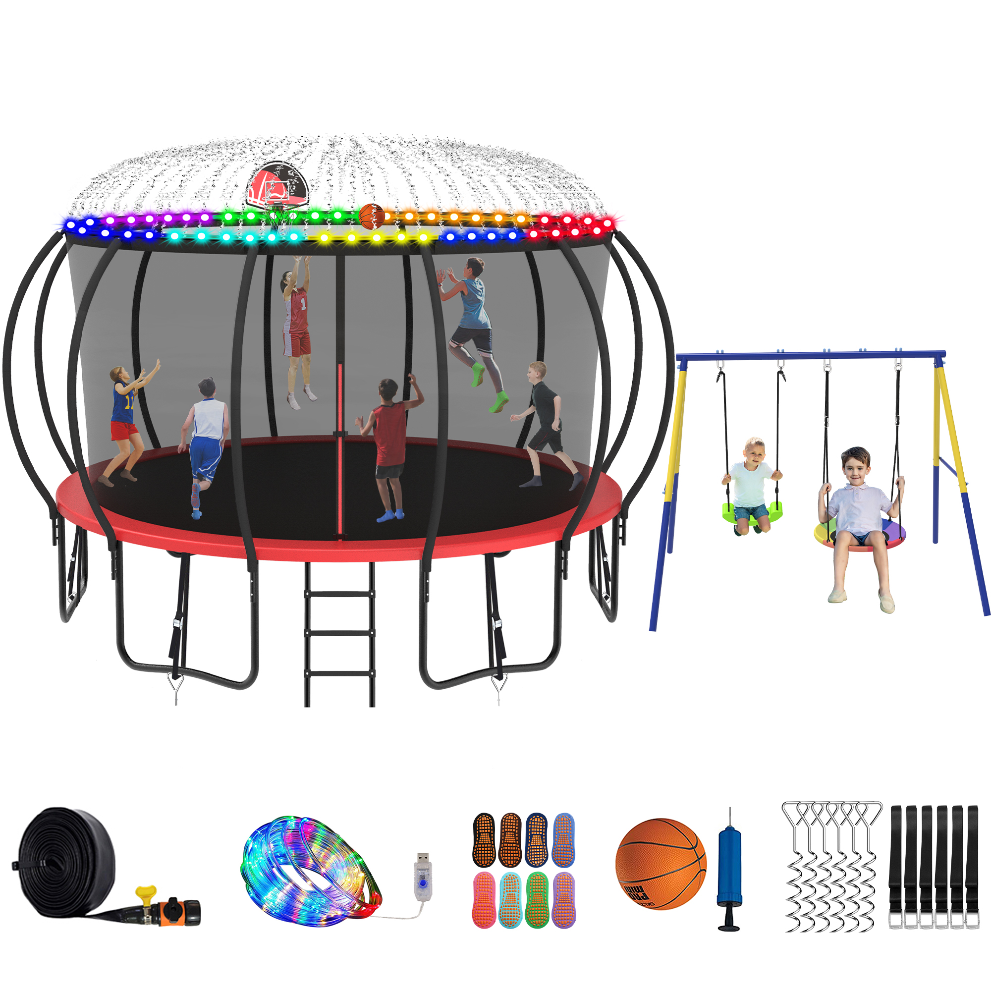 Jump Into Fun Trampoline 8 10 12 14 15 16FT, Trampoline with Enclosure, Basketball Hoop, Swing, LED Light and Gifts, 1500LBS Trampoline for 3-4 Adults/ 7-8 Kids, Outdoor Galvanized Spray Trampoline