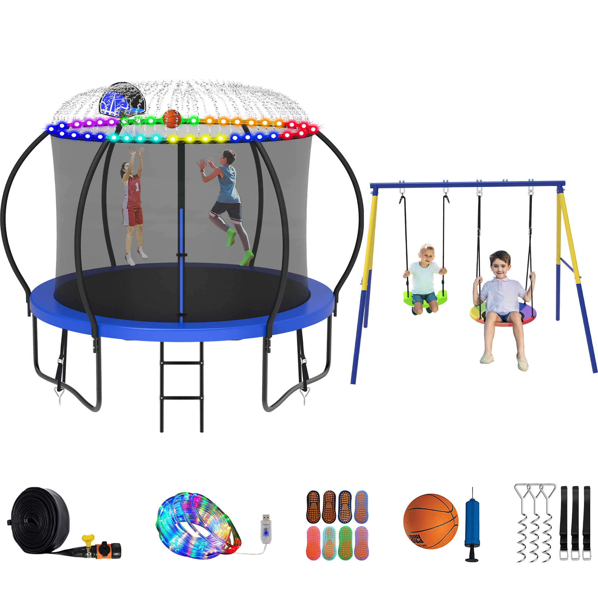 You're viewing: Jump Into Fun Trampoline 8 10 12 14 15 16FT, Trampoline with Enclosure, Basketball Hoop, Swing, LED Light and More Gifts, 1000LBS Trampoline for 3-4 Kids, Outdoor Galvanized Spray No Gap Trampoline$905.99