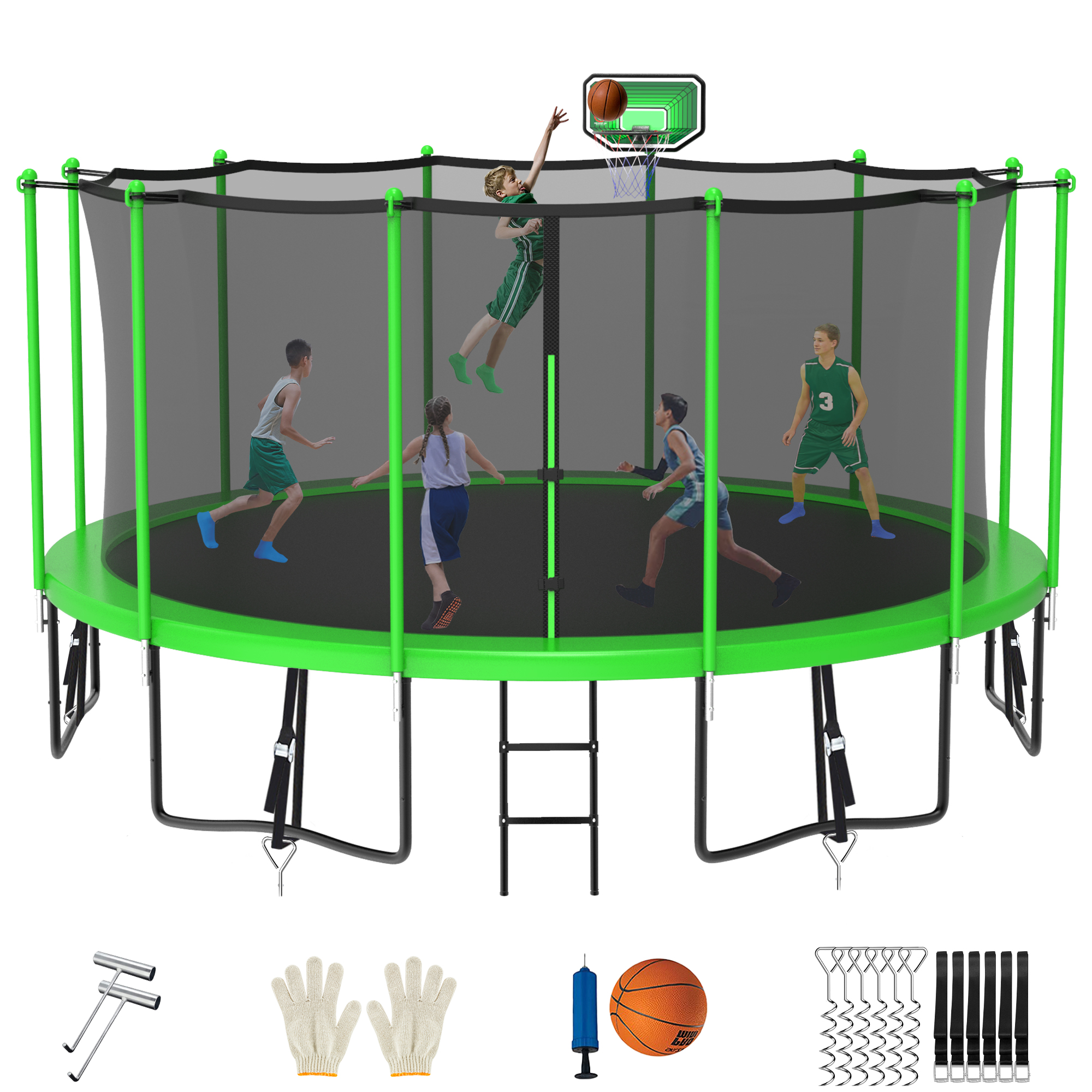 Jump Into Fun Trampoline 16FT, 1500LBS Trampoline for Adults/10 Kids, Outdoor Trampoline with Enclosure, Basketball Hoop, LED Lights, Sprinkler, Socks and Wind Stakes, Green